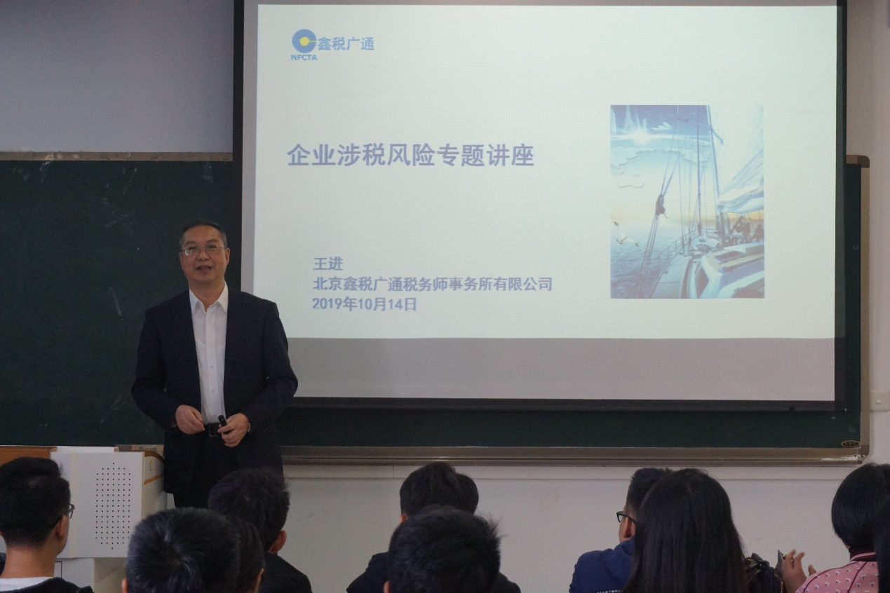 10月14日,应冰球突破豪华版官方网站邀请,北京鑫税广通税务师事务所有限公司董事长王进在北三教A405作题为“企业涉税风险”的专题讲座,学院40余名研究生参加。