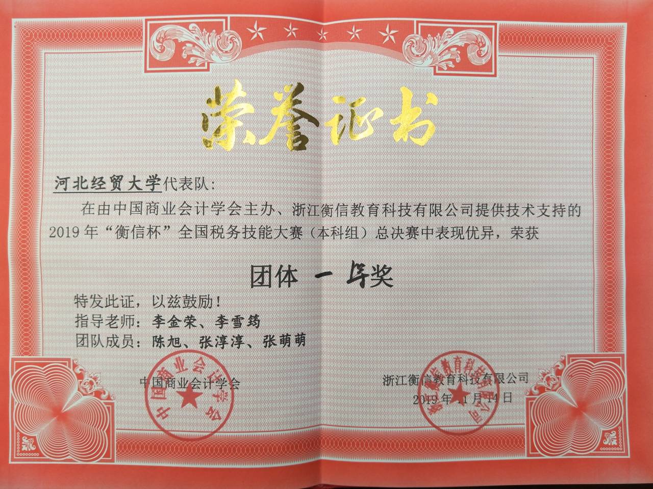 11月11—14日, 2019年“衡信杯”全国税务技能大赛总决赛在杭州举行,冰球突破豪华版官方网站代表队在本次比赛中荣获团体一等奖,张淳淳同学获得个人三等奖。张淳淳、陈旭、张萌萌同学获得衡信科技教育有限公司免试入职通知书。李金荣老师荣获优秀指导教师称号,李雪筠老师荣获优秀带队教师称号。