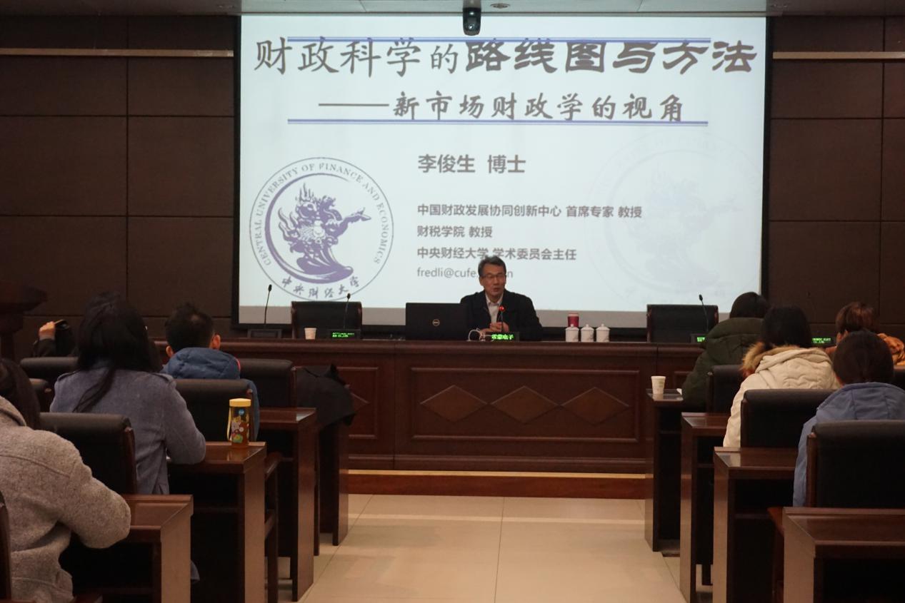 11月18日,中央财经大学李俊生教授应冰球突破豪华版官方网站邀请于第三会议室作题为“财政科学的路线图与方法——新市场财政学的视角”的学术报告,财税学院院长王晓洁主持,学院部分师生共100余人聆听了报告。