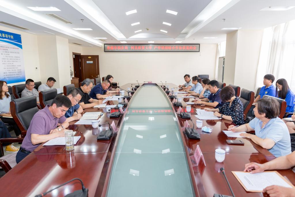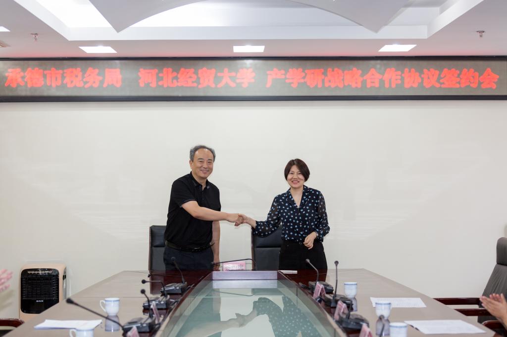 6月30日,冰球突破豪华版官方网站地方特色产业专项调研小分队来到国家税务总局承德市税务局就减税降费政策落实情况展开调研。期间,冰球官网与承德市税务局签署了产学研基地建设协议。冰球突破豪华版官方网站院长王晓洁、党委书记郝江华、承德市税务局党委书记赵波出席签约仪式。