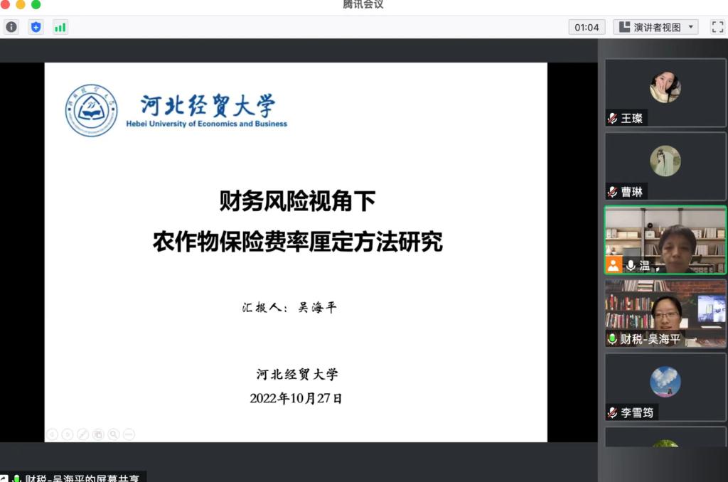 10月27日下午,冰球突破豪华版官方网站利用腾讯会议举办了以“财务风险视角下农作物保险费率厘定方法研究”为主题的沙龙活动。本次沙龙活动由温立洲副院长主持,吴海平老师主讲,郝江华书记、王晓洁院长以及财税学院全体教师以及其他学院部分教师参加了此次活动。