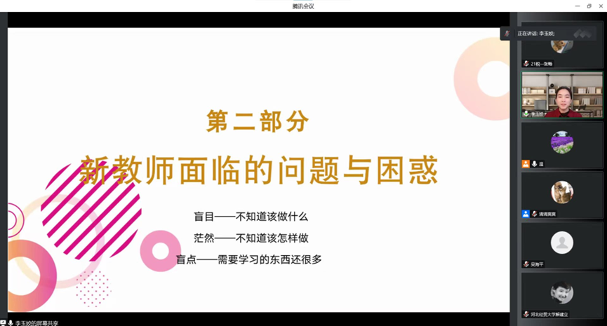 11月10日下午,财税学院利用腾讯会议举办了以“用爱履行职责,用心承载教育——新入职教师心得体会”为主题的沙龙活动。本次沙龙活动由温立洲副院长主持,李玉姣老师主讲,郝江华书记、王晓洁院长以及财税学院全体教师以及其他学院部分教师参加了此次活动。