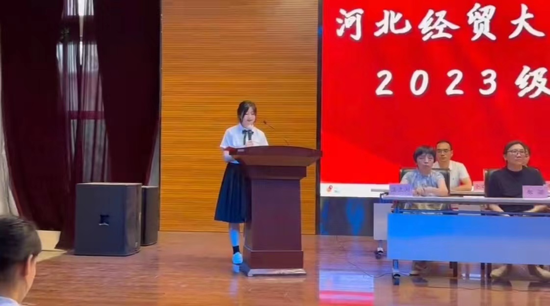 刘睿桐同学表达了来到经贸美丽校园的喜悦心情,并且提出了大学时期的学习、生活规划安排,表明会珍惜大学时光,不断提升自己,不辜负老师和家长的期望。在最后,她号召2023级新生珍惜时光,努力拼搏,肩负起时代使命。