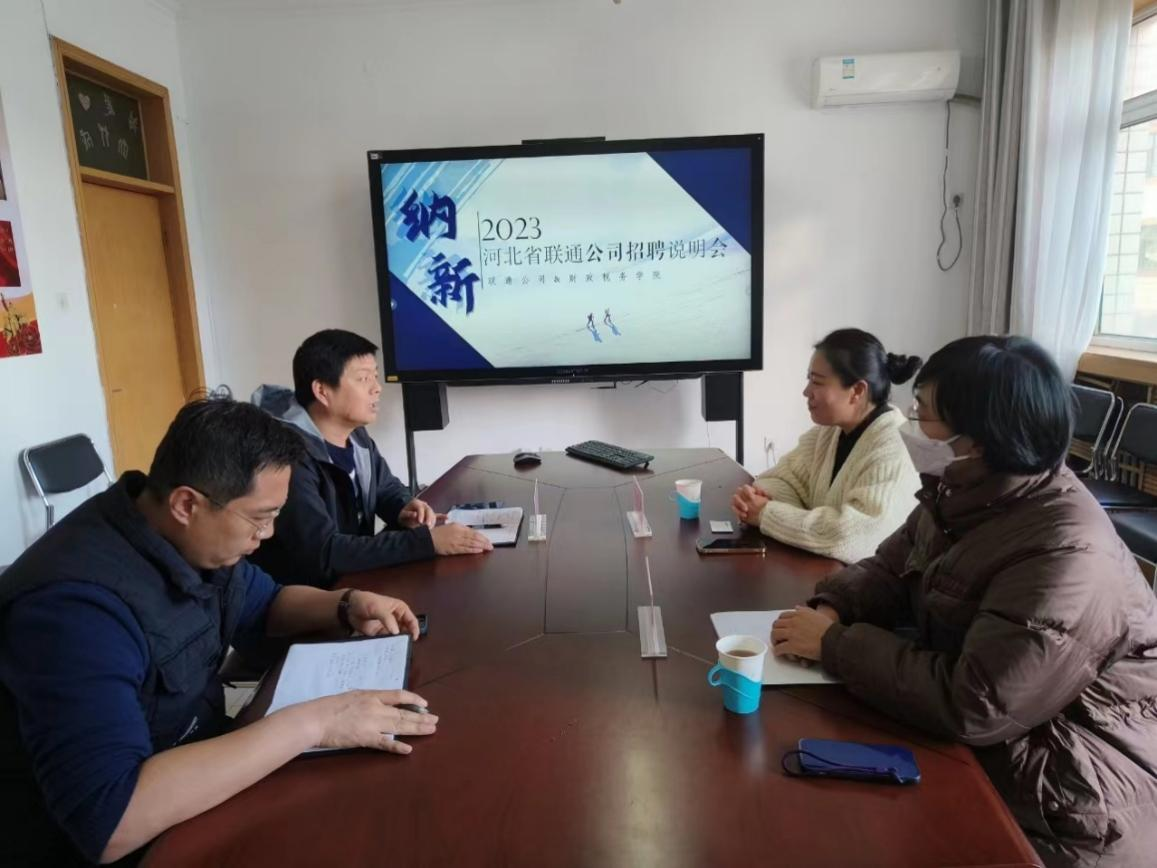 为精准对接企业用人需求,促进毕业生高质量就业,11月23日,冰球突破豪华版官方网站与河北省联通公司开展招聘对接会,党委书记郝江华、辅导员翟勤及河北省联通公司相关负责人参会。