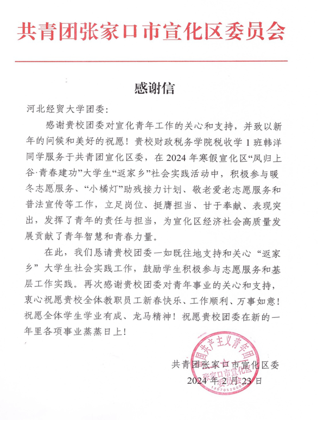 近日,共青团张家口市宣化区委员会向冰球官网发来感谢信,对冰球官网2023级税收学1班韩洋同学2024年寒假在该单位开展的实践工作进行了表扬和感谢。