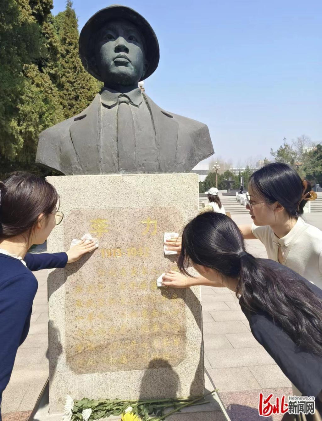 在烈士陵园,同学们肃立、默哀、鞠躬,向长眠在此的烈士致敬。学生代表讲解了白求恩、柯棣华、马本斋等6名英烈的革命事迹,同学们用自带的手帕认真擦拭烈士墓碑和雕塑,表达对烈士深深的敬意和缅怀。