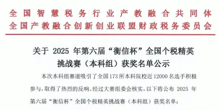 2025年5月,全国智慧税务行业产教融合共同体主办了第六届“衡信杯”全国个税精英挑战赛(本科赛道),共有来自全国173所本科院校的近12000名选手同场竞技,共同展现财税专业领域的知识储备与实践能力。通过系统培训、模拟演练等方式提升学生的专业素养。2025年5月7日至5月20日,通过连续14天的线上比赛,学院93名同学持之以恒地凭借扎实的专业功底和出色的临场发挥,最终脱颖而出,荣获团体赛一等奖,充分展现了冰球官网学子的卓越风采与专业水平。