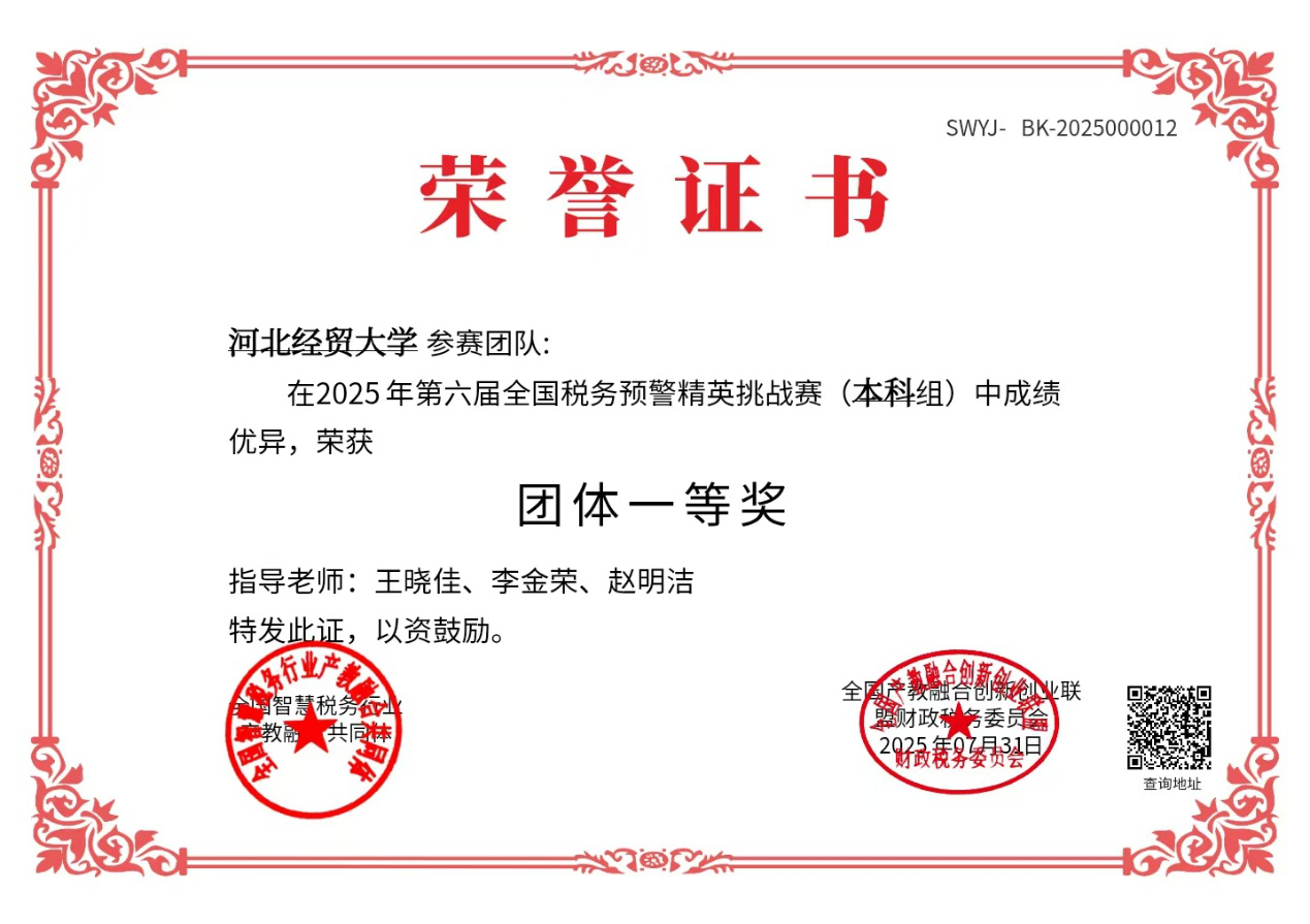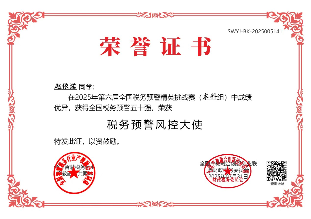 2025年7月,全国智慧税务行业产教融合共同体主办了第六届“衡信杯”全国税务预警精英挑战赛(本科院校赛道),共有来自全国124所本科院校的近5800名选手同场竞技,共同展现财税专业领域的知识储备与实践能力。通过系统培训、模拟演练等方式提升学生的专业素养。2025年7月7日至7月27日,通过连续21天的线上比赛,学院257名同学持之以恒地凭借扎实的专业功底和出色的临场发挥,最终脱颖而出,再次荣获团体赛一等奖,其中,2024级研究生赵依诺同学更是以优异的成绩跻身全国前50强并荣获税务预警风控大使,实现学院零的突破,充分展现了冰球官网学子的卓越风采和专业水平!