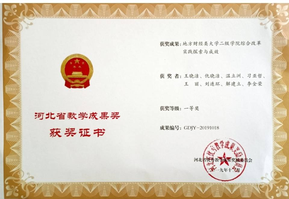 日前,河北省教育厅发布了《河北省教育厅关于公布第八届河北省高等教育教学成果奖获奖名单的通知》(冀教高〔2019〕24号),冰球官网2项教学成果获第八届河北省高等教育教学成果奖,其中,冰球官网“地方财经类大学二级学院综合改革实践探索与成效”教学成果获得一等奖。