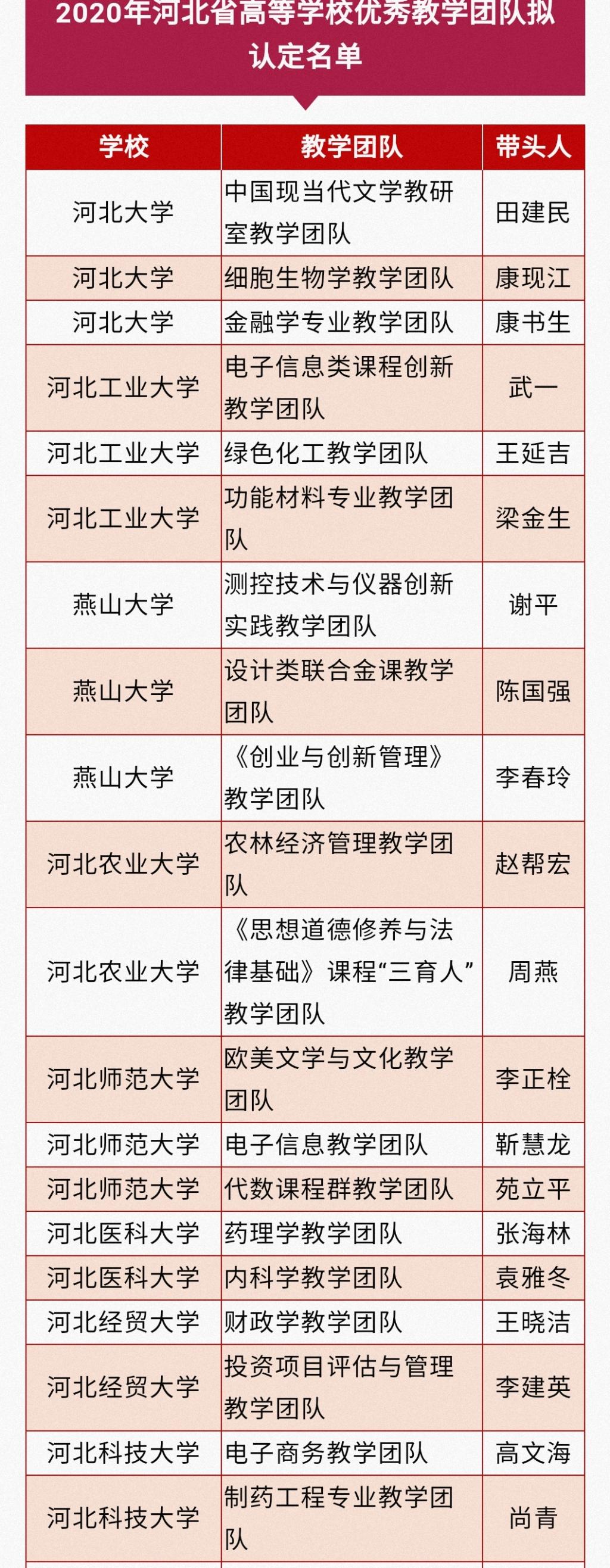 河北省教育厅高等教育处最新发布2020年度河北省普通高等学校本科教学名师和优秀教学团队拟认定名单的公示,经过学校的遴选推荐和专家评审,评选出拟认定河北省普通高等学校本科教学名师72名与优秀教学团队75个。其中冰球官网财政学教学团队荣获2020年河北省高等学校优秀教学团队称号。