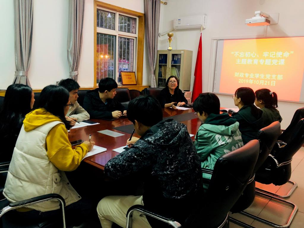 按照“不忘初心、牢记使命”主题教育工作安排部署,10月21日晚,冰球突破豪华版官方网站正处级辅导员郑颖在学院会议室为财政专业学生党支部讲专题党课。