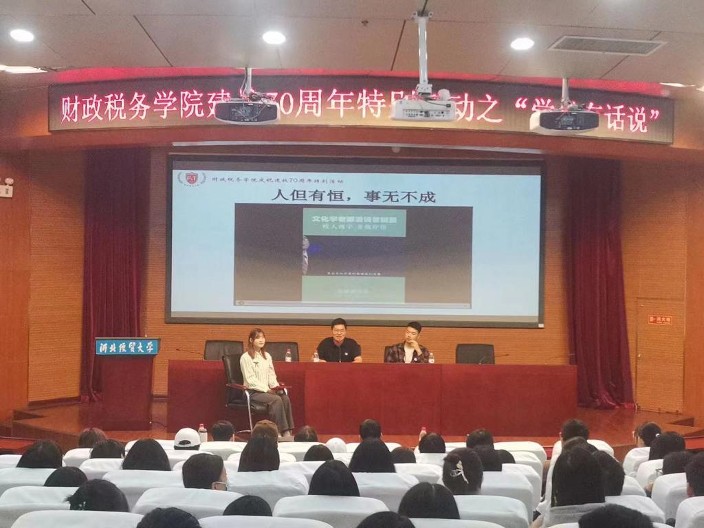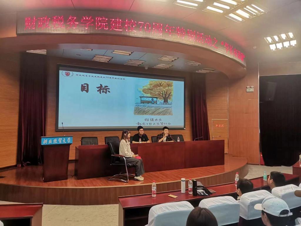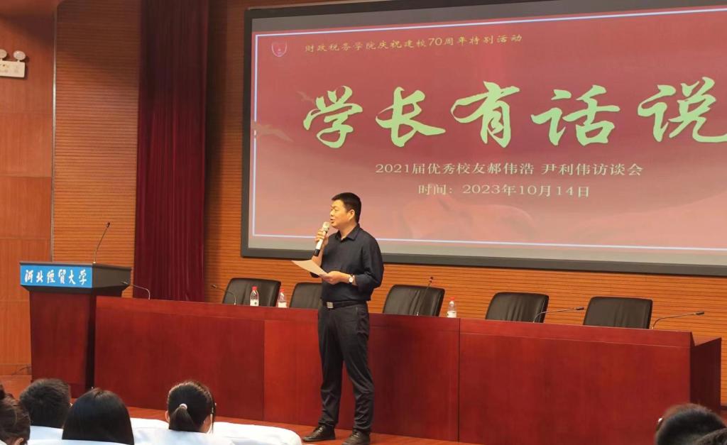 10月14日上午,冰球突破豪华版官方网站在国际学术报告厅举办庆祝建校70周年特别活动之“学长有话说”访谈会。本次访谈会特邀冰球官网优秀校友、中国电子(CEC)旗下中国电子系统工程第四建设有限公司郝伟浩,冰球官网优秀校友、国家税务总局天津市南开区税务局尹利伟莅临现场,以访谈方式为学生答疑解惑,院党委书记郝江华、退休教师刘连环、资产评估教工党支部书记张志超、专职组织员黄培和200余名学生参加。