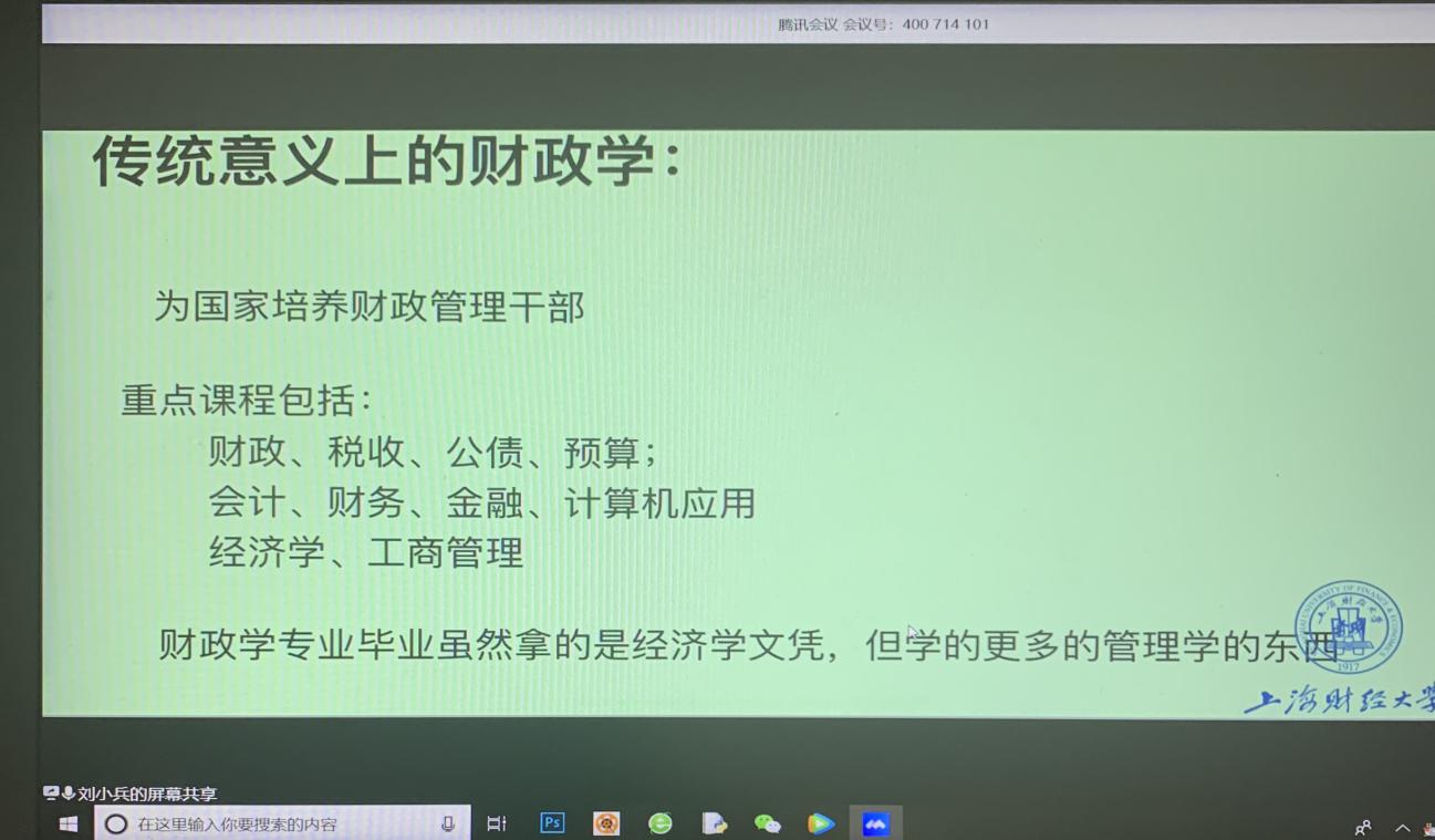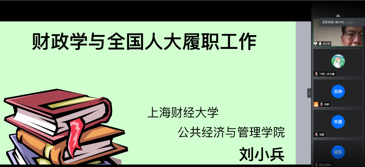6月1日下午,上海财经大学公共经济与管理学院院长、博士生导师、第十三届全国人大代表刘小兵教授应冰球突破豪华版官方网站邀请,通过腾讯会议平台为同学们作题为“财政学与全国人大履职”的报告。本次报告由王晓洁院长主持,仇晓洁院长做点评,冰球突破豪华版官方网站部分师生共200余人在线聆听了本次报告。