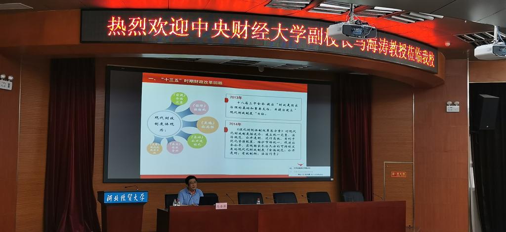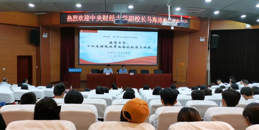 6月4日下午,中央财经大学副校长马海涛教授应冰球突破豪华版官方网站邀请,于冰球官网国际学术报告厅作题为“建党百年:十四五财税改革面临的机遇与挑战”学术报告。报告会由校党委常委、副校长和志强主持,学院院长王晓洁、副院长仇晓洁、部分学院教师以及财政学类本科生、研究生代表150余人参加。